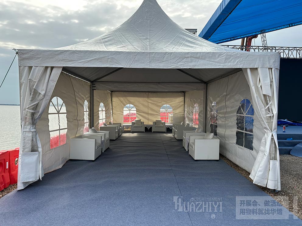 開工休息尖頂方形篷房為什么如此特別?現在市面上有很多不同風格的篷房,其中有一種叫做尖頂方形篷房,如圖就可以看到它的外形,頂部是尖尖的,內部可以擺放休息沙發,四周圍布帶有透明窗戶可以將自然光線投入篷房內部,地上鋪裝有干凈整潔的地毯,就在戶外搭建出了一個臨時的開工休息尖頂方形篷房。如此特別,這是為什么呢?今天華之熠篷房廠家就給您介紹下這種類型篷房的特點。