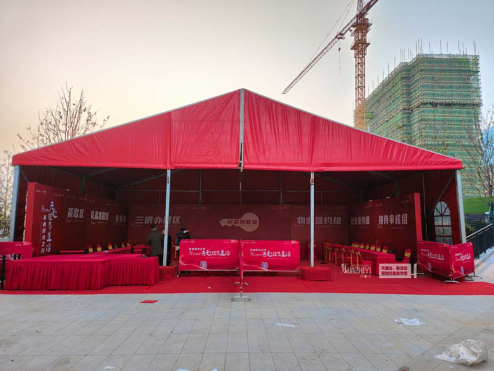 鄭州篷房租賃搭建交房現場紅色地產篷房。在山西晉城的建業相府交房儀式上,一座紅色的篷房十分引人注目。這是鄭州華熠公司搭建的地產篷房,篷內有桌椅、護欄和明確的指示標牌,為到場的業主們提供了更多的便利。