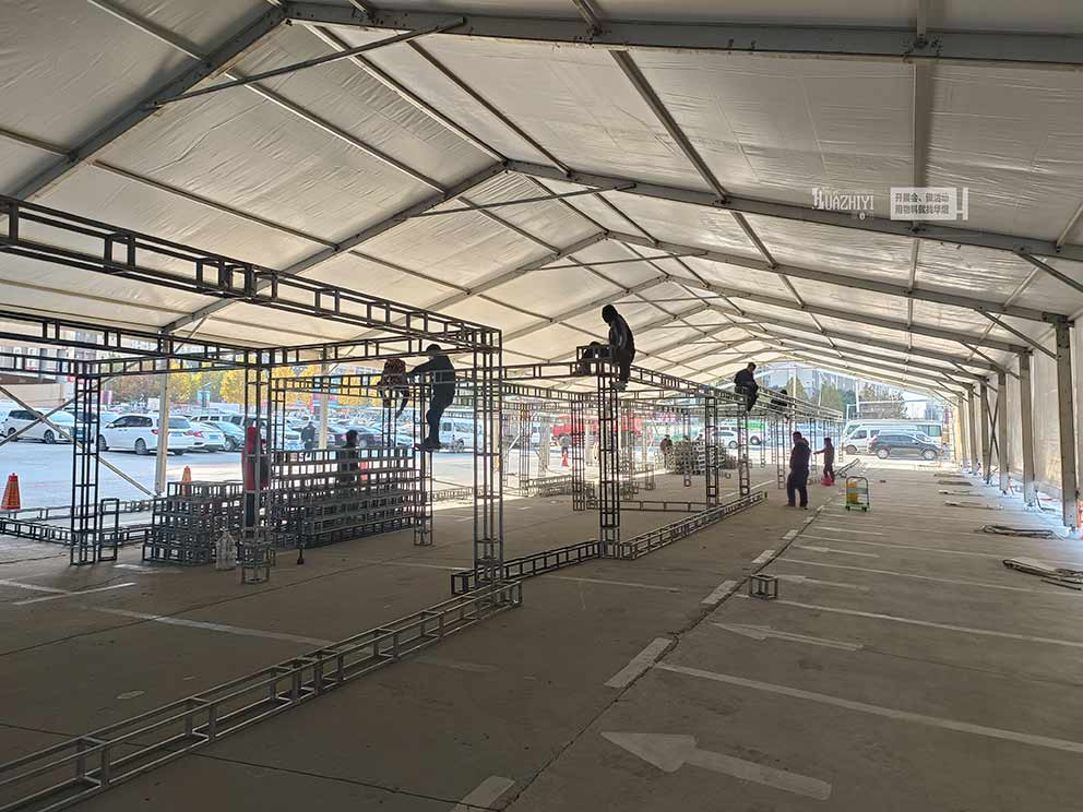 鄭州活動篷房出租篷內還可以搭建桁架展位。對于華熠公司來說,搭建篷房和桁架都是我們十分熟悉掌握的業務技能,今天的這種搭配作為展銷會區域劃分也是十分靈活的,華熠公司可以為您定制策劃方案,來詳細了解一下吧。