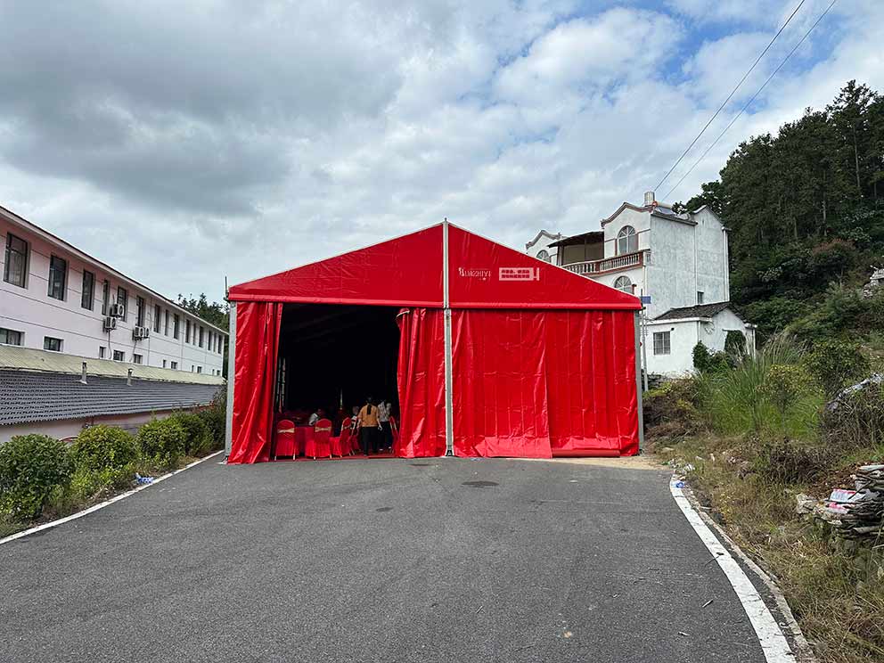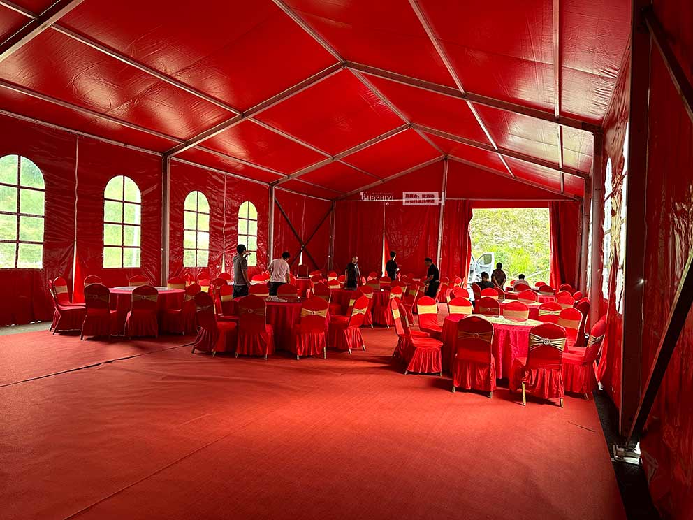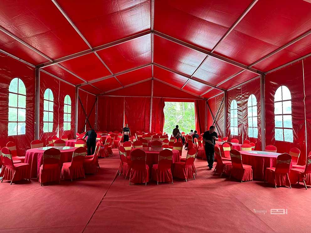 焦作篷房租賃為婚禮搭建的紅色篷房,是整個(gè)場(chǎng)地布置的核心亮點(diǎn)。篷房采用大跨度人字形設(shè)計(jì),篷身選用高密度紅色PVC篷布,色澤濃郁飽滿,在陽(yáng)光下呈現(xiàn)出熱烈而不失莊重的質(zhì)感;篷布表面經(jīng)過(guò)特殊處理,不僅防雨防曬,還能有效提升篷內(nèi)亮度。