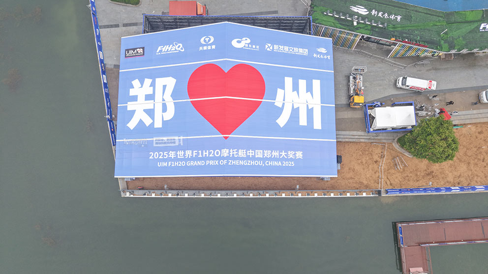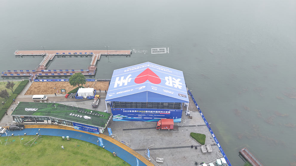 棚頂醒目位置印制了碩大的賽事全稱“2025年世界F1H2O摩托艇中國(guó)鄭州大獎(jiǎng)賽”與“鄭州”字樣。篷房采用大跨度人字形結(jié)構(gòu),四周無篷布的開放式設(shè)計(jì),讓篷房既保持通透開闊的視野,又能讓棚頂?shù)馁愂聵?biāo)識(shí)從各個(gè)角度清晰可見,成為賽場(chǎng)周邊極具辨識(shí)度的視覺焦點(diǎn),向全球觀眾傳遞著鄭州承辦國(guó)際賽事的熱情與實(shí)力。